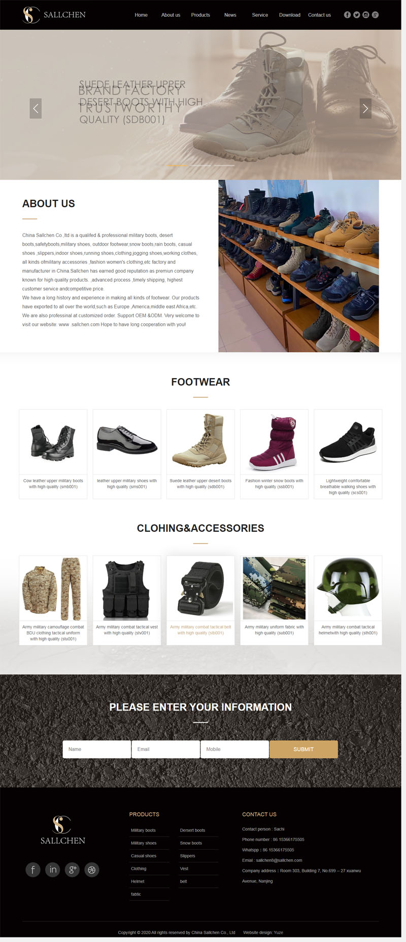 China Sallchen Co.,ltd is a qualified & professional footwear manufacturer in China for almost 20 years. We mainly supply military boots,desert boots,safety boots,hunting boots,military shoes,outdoor footwear,snow boots,rain boots,casual shoes,slippers,indoor shoes,running shoes,clothing,jogging shoes,working clothes,all kinds of military accessories,fashion women's clothing,etc. Sallchen has earned good reputation that known for high quality products,advanced process,timely shipping, highest customer service and competitive price.